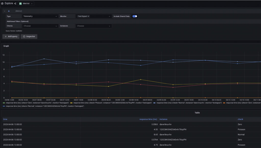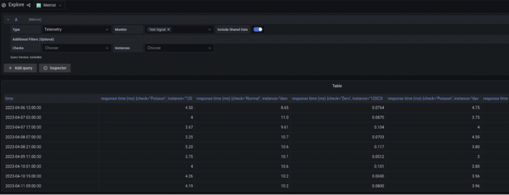 To address that we ended up including two sets of frames in two different formats in the response and to tell Grafana which frames should be used for graphing and which frames should be used for tabular display via the frame metadata. We ended up discovering this strategy by using the Grafana Inspector and looking at the returned JSON data from other Datasource plugins that were displaying everything in the desired way. The PreferredVisualization field of the frame Meta metadata field allows you to identify which frames should be used for Graph visualizations vs Tabular visualizations with VisTypeGraph and VisTypeTable respectively.