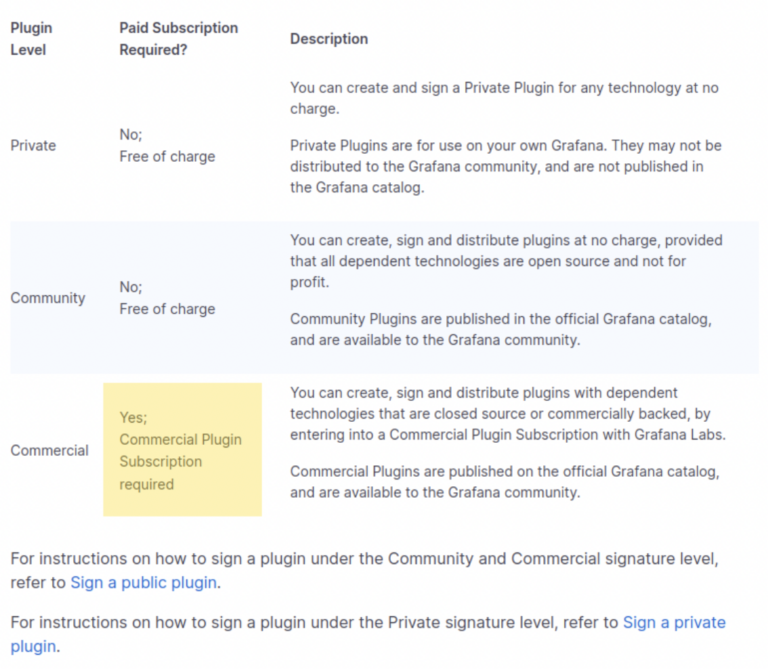 To do that, we have to address the elephant in the room. If any part of your product that you are pulling data from or integrating into is closed source, we would highly recommend that you reach out to Grafana to determine what the cost of your Commercial Plugin Subscription will be before you start development. Without it, you will not be able to sign your plugin for public distribution or include it in the catalog. Being included in that catalog is also what enables your plugin to be installed on Grafana Cloud instances which are being used more and more today. The only real reference on the grafana.com docs site you will find to this requirement is on the Sign a plugin under plugin signature levels. We had seen that callout, and were fully prepared to pay a fee for that license but you won’t find mention of the fee itself anywhere on the Grafana site.